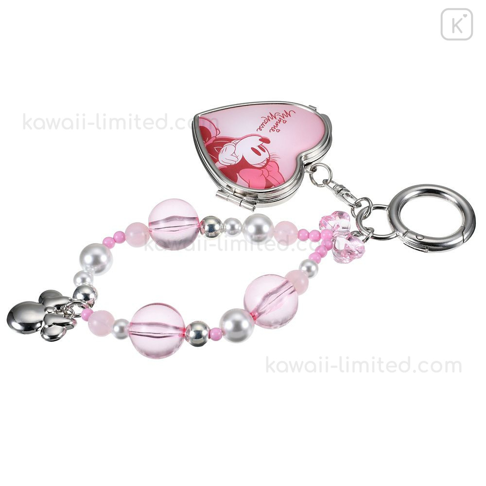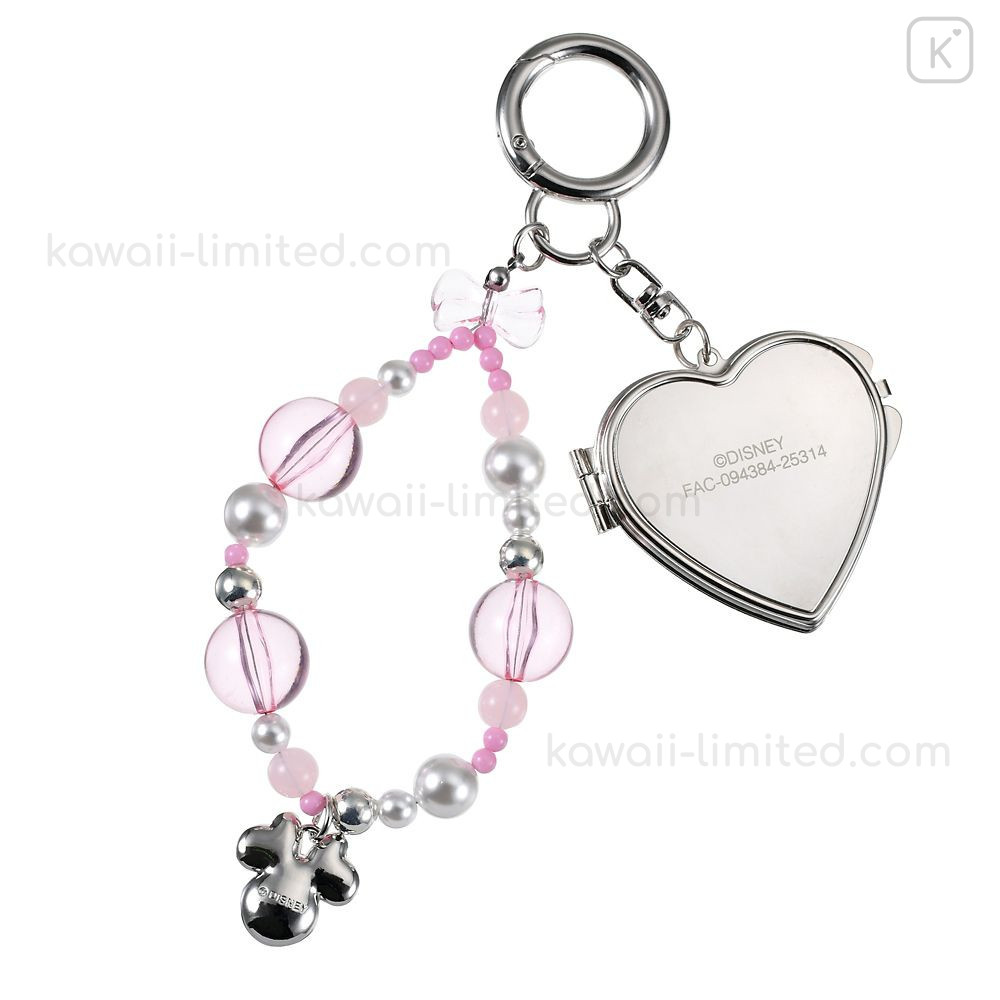 Japan Disney Store Heart-Shaped Mirror with Bead Keychain Strap Keychain - Minnie : Light Pink