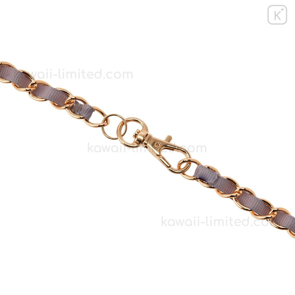 The gold-colored chain strap with woven ribbon is also a highlight.