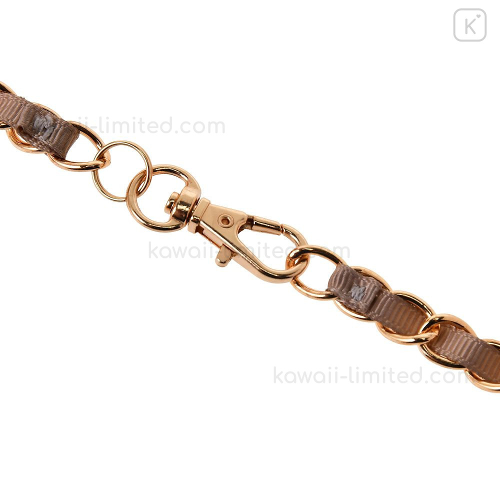 The gold-colored chain strap with woven ribbon is also a highlight.