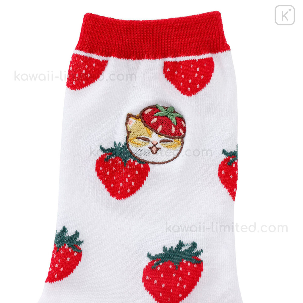 Japan Mofusand Embroidered Low Crew Socks - Mofusand Merci Strawberry Fruit Cat Red White