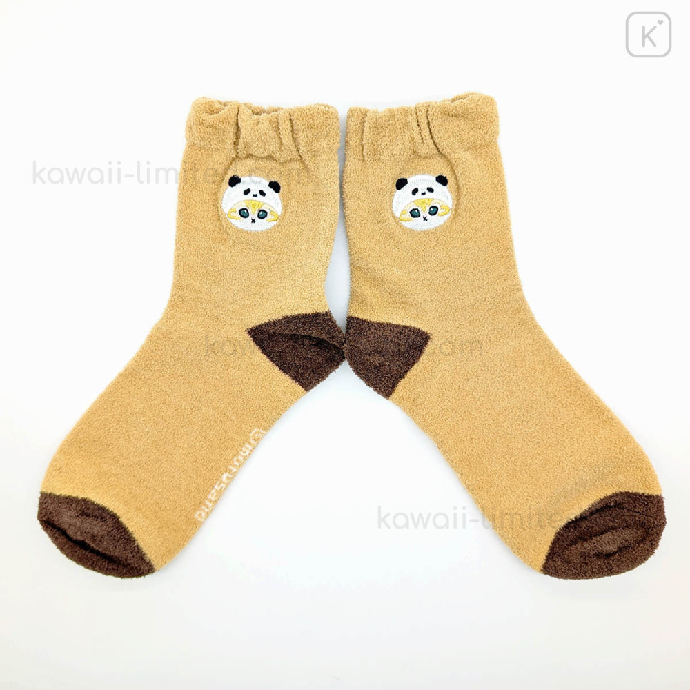 Japan Mofusand Fluffy Low Crew Socks - Panda Cat Embroidery Caramel