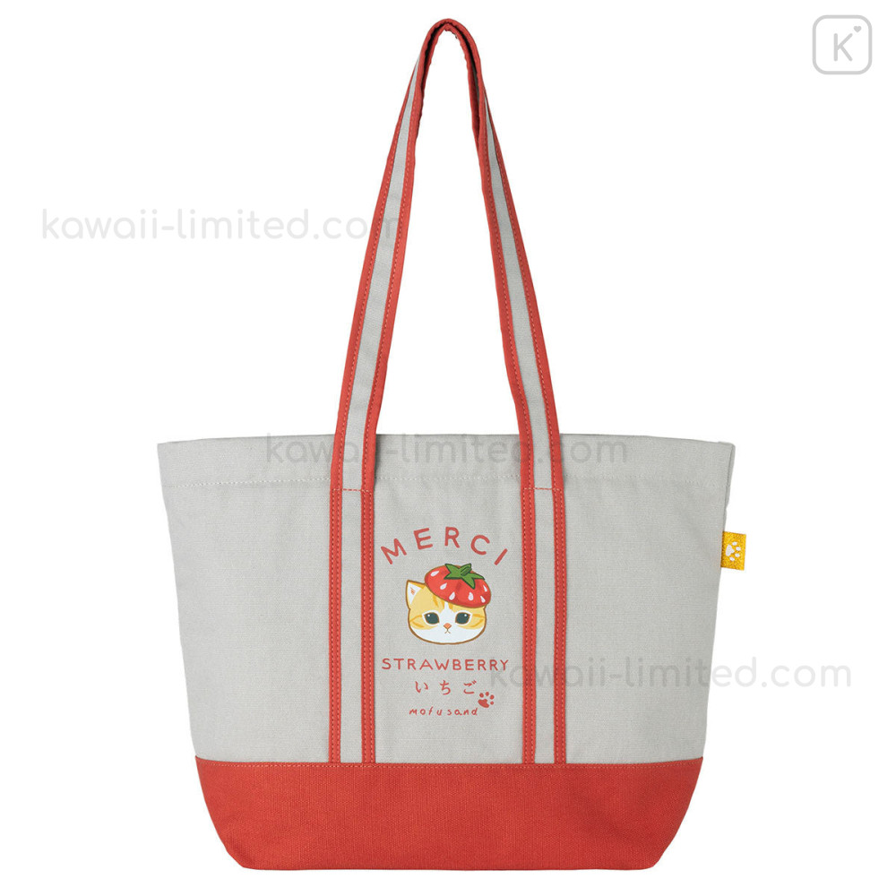 Japan Mofusand Large Gusseted Tote Bag - Mofusand Merci Strawberry Fruit Cat Red Grey