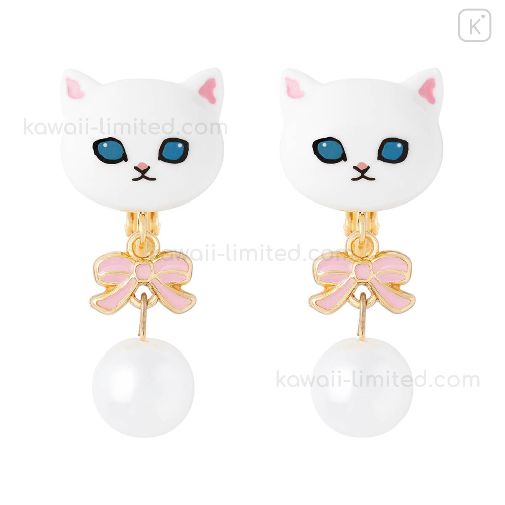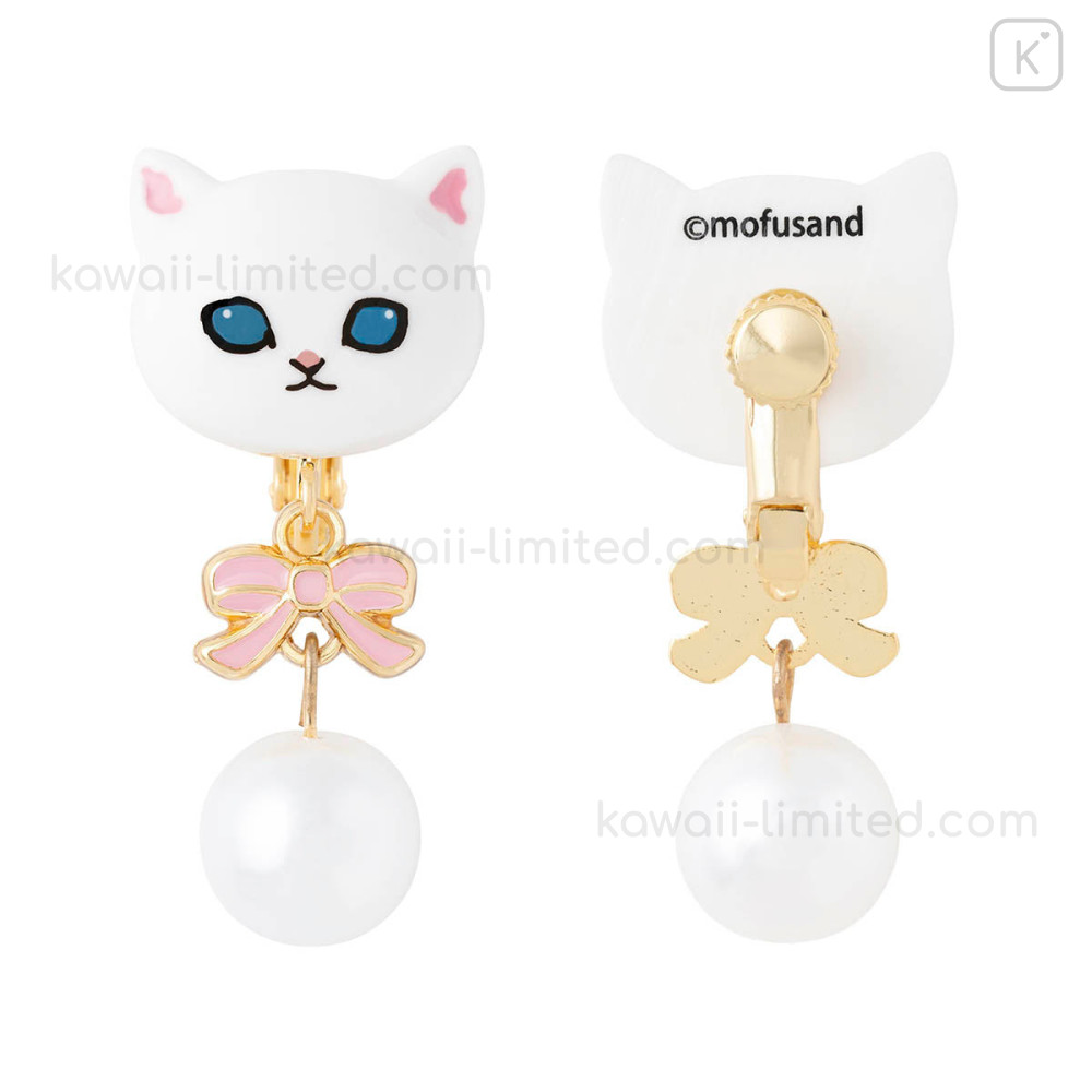 Japan Mofusand Swinging Clip-on Earrings - Pearl Ribbon Cat White