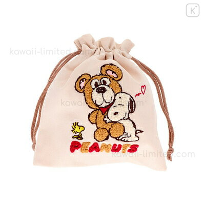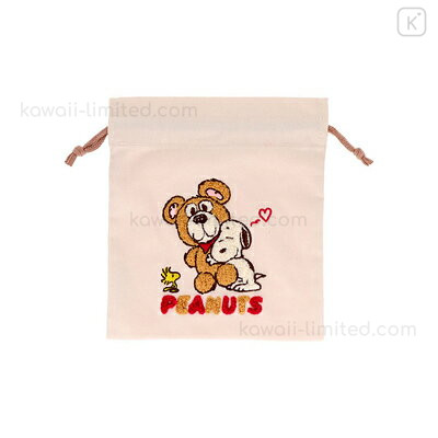 Japan Peanuts Embroidered Drawstring Bag - Snoopy & Woodstock : Cuddly Bears Beige Brown