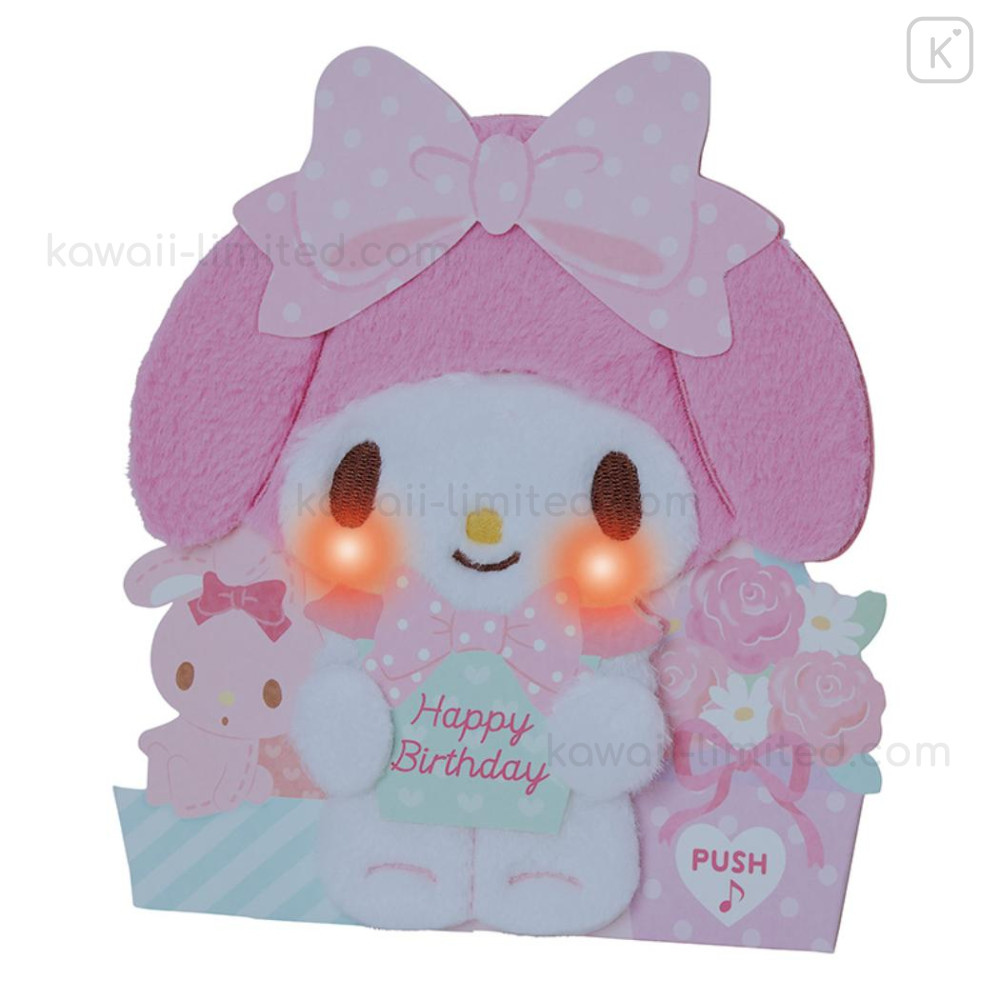 It features a fluffy, light-up My Melody cheek and can be displayed upright.
