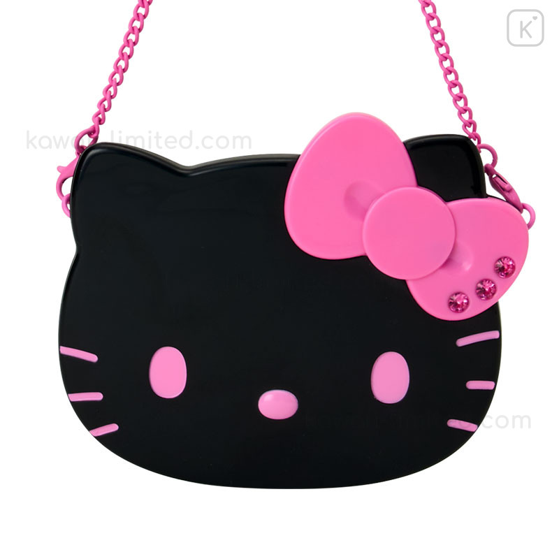 Japan Sanrio Original 2-sided Compact Mirror with Chain - Hello Kitty : I Love Hello Kitty Face Black Pink
